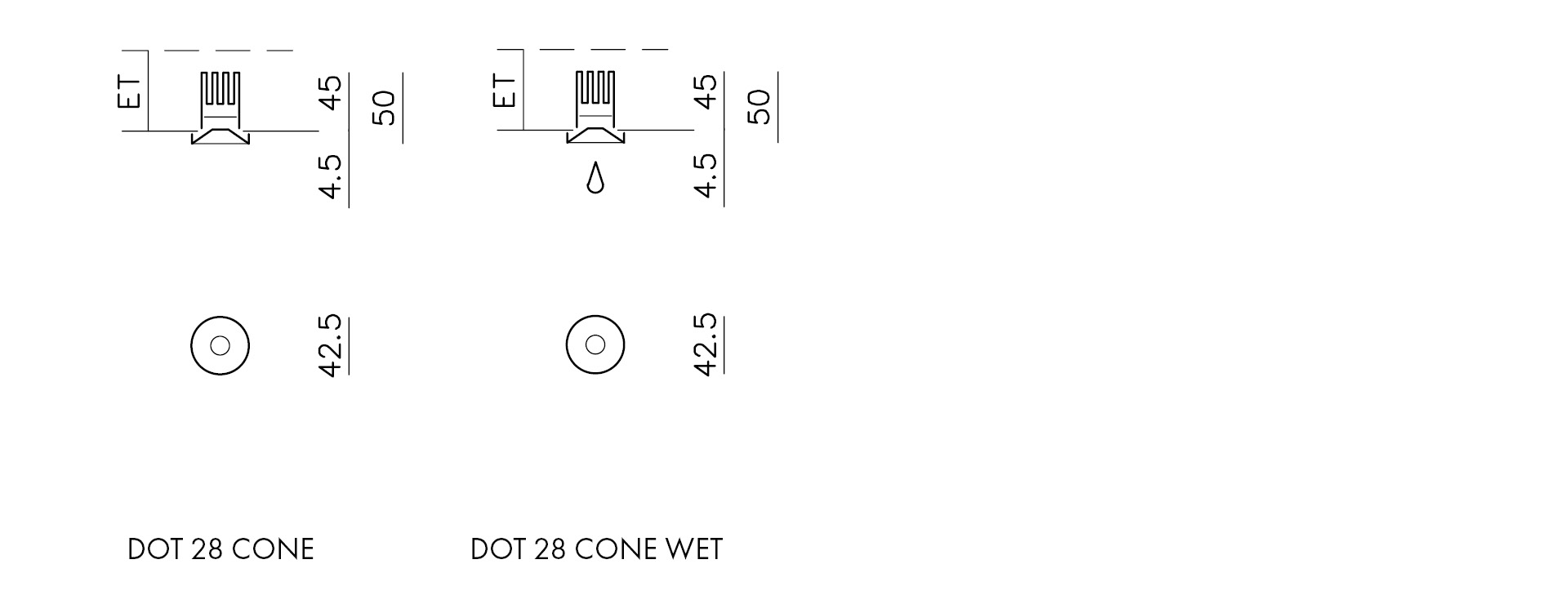 3771_ _ _DOT 28 CONE WET | IP44, Halbeinbauleuchte für Einbau in SYSTEM DOT 28, allseitig spritzwassergeschützt, aus massivem Aluminium, passive Kühlung beachten