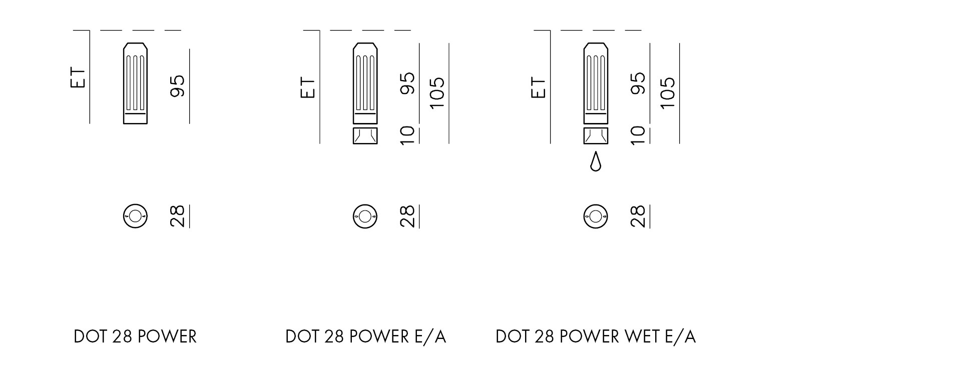 DOT 28 POWER WET | IP44, für flächenbündigen Einbau in das SYSTEM DOT 28, allseitig spritzwassergeschützt, aus massivem Aluminium, passive Kühlung beachten, Einbautiefe ET = Moduleinbautiefe +60mm außer bei Kapseln